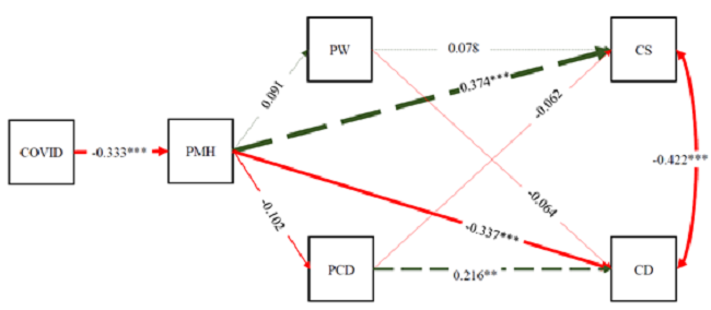 The psychological impacts of COVID-19 had a statistically significant negative direct effect on parental mental health (β=-.333, p = .000). Parental mental health had direct statistically significant effects on the child’s behavior: negative on the child’s difficulties (β=-.337, p = .000) and positive on their strengths (β=.374, p = .000). The parental coercive discipline had a statistically significant direct positive effect on the child’s difficulties (β=.216; p < .001).