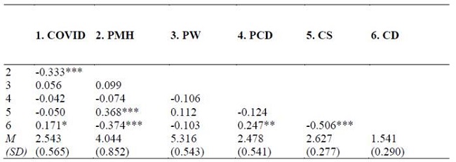 Table 1 presents the correlations, means and standard deviations of the variables that composed the model tested in this study (Figure 1). Table 2 and Figure 2 contain the main results of the model of the psychological impacts of COVID-19 on parental mental health, parenting and child behavior, which presented an excellent fit (S-B χ2=7.602 (5), p=.180; Robust CFI =.974; Robust RMSEA =.059; SRMR=.036). In it, 16.0 % of the child’s strengths were explained by the parental variables of parental mental health, warmth and coercive discipline, whereas 18.3 % of the child’s difficulties were explained by the same parental variables. In addition, 11.1 % of parental mental health was explained by the psychological impacts of COVID-19 on the participant.
