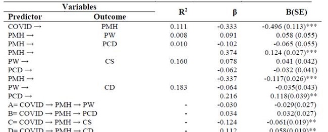 The psychological impacts of COVID-19 had statistically significant mediated effects on the child’s behavior. They were negative regarding the child’s strengths both indirectly through parental mental health (β=-.124, p < .01), and on the total effect - sum of the three possible mediation paths in relation to the parental variables: 1) the psychological impacts of COVID-19 affecting parental mental health and consequently the child’s strengths; 2) the psychological impacts of COVID-19 affecting parental mental health and consequently parental warmth and the child’s strengths; 3) the psychological impacts of COVID-19 affecting parental mental health and, consequently, parental coercive discipline and the child’s strengths; (β=-.129, p < .01). Regarding the child’s difficulties, the effects were positive both indirectly through parental mental health (β=.112, p < .01), and on the total effect - sum of the three possible mediation paths in relation to the parental variables: 1) the psychological impacts of COVID-19 affecting parental mental health and consequently the child’s difficulties; 2) the psychological impacts of COVID-19 affecting parental mental health and consequently parental warmth and the child’s difficulties; 3) the psychological impacts of COVID-19 affecting parental mental health and consequently parental coercive discipline and the child’s difficulties; (β=.121, p < .01).