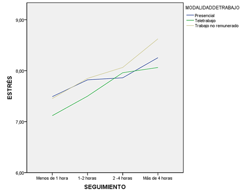 Se observó que mientras aumentan las horas de seguimiento educativo, los niveles de estrés también ascienden. El grupo de trabajo no remunerado puntuó más alto en estrés cuando destina más de 4 horas diarias a esta actividad. En cambio, al dedicar menos de 1 hora a esta función, el estrés disminuye siendo el grupo de teletrabajo el de menores puntuaciones.