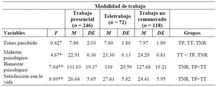 En esta sección se presenta el análisis descriptivo de las puntuaciones directas de las variables estrés, malestar psicológico, bienestar psicológico y satisfacción con la vida, además del estudio comparativo mediante un análisis de varianza (ANOVA) de una vía en función de la modalidad de trabajo (ver Tabla 1).