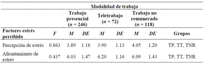 Los resultados muestran que las tres modalidades de trabajo (presencial, teletrabajo y trabajo no remunerado) presentan similitudes en los factores percepción de estrés y afrontamiento de estrés (Tabla 2) y en el nivel total de estrés (Tabla 1). Una explicación tentativa es que las participantes en general están expuestas a factores estresantes similares. Tchimtchoua (2020) señala que las madres han enfrentado cambios repentinos de rutinas e interacción social. Son ellas quienes compaginan el cuidado de los niños, el estar en casa, sus responsabilidades, preocupaciones laborales, financieras y salud.