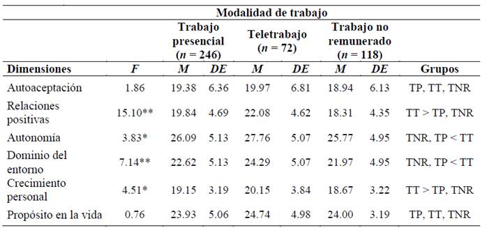 Se observó que en las dimensiones de autoaceptación y propósito en la vida no se encontraron diferencias estadísticamente significativas entre las modalidades de trabajo. Sin embargo, en la dimensión relaciones positivas se evidenció diferencias en cuanto a las medias entre los grupos de modalidad de trabajo. Las pruebas post hoc basadas en Gabriel indicaron que el grupo de trabajo no remunerado presentó menores niveles en comparación de los otros dos grupos. El grupo de teletrabajo reportó mayores relaciones positivas. Sobre la autonomía, el ANOVA mostró diferencias estadísticamente significativas, el grupo de trabajo no remunerado presentó niveles más bajos a diferencia del presencial y teletrabajo.
