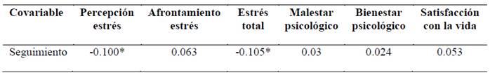 El ANCOVA indicó que, en el caso del malestar psicológico, bienestar psicológico, satisfacción con la vida y afrontamiento de estrés, el seguimiento no actúa como covariable. En cambio, en la Figura 1 se puede observar cómo el seguimiento actuó como covariable en la percepción de estrés (F = 4.92; p = .02) y el estrés total (F = 5.13; p = .02).