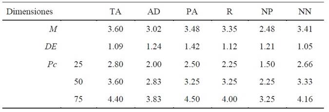 En la Tabla 4 se agruparon las puntuaciones medias y los niveles que indican presencia de cada dimensión de la Escala de Autocuidado en participantes de población general. A su vez, se definieron los percentiles de cada dimensión. Para la obtención de los valores percentilares, se deben sumar los puntajes brutos obtenidos en cada dimensión y dividirlo por el número de ítems. Un puntaje T superior a 50 indica presencia de la dimensión que conforma al constructo autocuidado.
