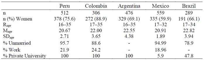The most salient demographic characteristics can be seen below (Table 1). It should be stressed that most students are unmarried, almost a fifth of them work, and Mexican students primarily attend public institutions, while the Peruvian, Argentine, and Colombian students primarily attend private universities. The size of the sample is appropriate in all cases, considering that this is a one-dimensional model with fewer than 10 items and with anticipated factorial loadings of .70 (Wolf et al., 2013). Finally, after homogenizing the comparisons, only participants younger than 36 were included as is the case with other studies where data from various different sources are considered (Potthoff et al., 2016).