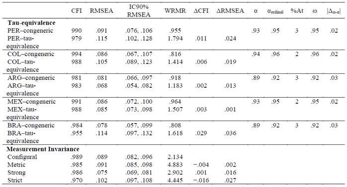 The structural analysis reveals the fulfillment of a one-dimensional structure, with respect to the fit indices, the factor loadings and the AVE (> .50), and with minor differences between the highest and lowest factor loading (Table 3). With respect to reliability, in most of the samples (except for Brazil and Peru) the assumption of tau-equivalence was met for an appropriate estimate of the coefficient α. In addition, all of the reliability indicators were favorable (> .80) and virtually the same in terms of magnitude (Table 2).