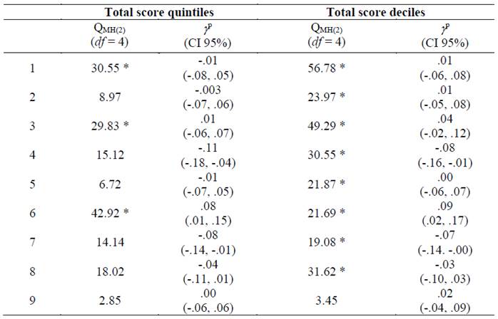 As for DIF, when the total score was divided into quintiles and deciles (Table 4), the QMH(2) statistic detected three items with probable differential functioning (items 1, 3 and 6) , with QMH(2) > 28.0 (p< .0005). The p coefficients ranged from , and for items detected with DIF, the p coefficients ranged from