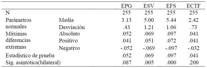 En la Tabla 1 se observan los resultados de la prueba de normalidad. En esta prueba se utilizó el estadístico Kolmogorov-Smirnov, debido a que es el más idóneo para tamaños muestrales de más de 50 casos. Se encontró que solamente las variables PEG y ECTF se distribuyen normalmente (p < .05).