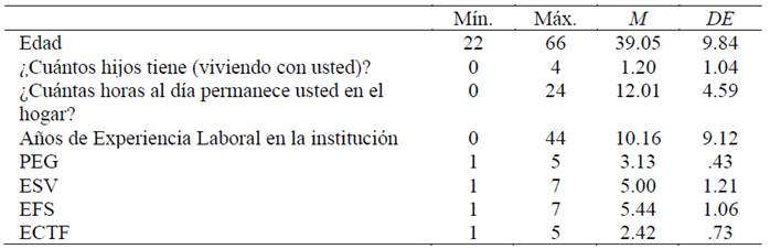 La Tabla 2 muestra los estadísticos descriptivos de las variables edad, cantidad de hijos, horas que permanece en el hogar, años de experiencia en la institución y las escalas de conflicto trabajo-familia (ECTF), percepción de equidad de género (PEG), satisfacción vital (ESV) y felicidad subjetiva (EFS). En la escala EFS se observa una media mayor (M= 5.44) en comparación al punto medio de la misma escala (M = 3.5), al igual que la escala ESV (M = 5.00) y la escala PEG (M = 3.13). En cambio, la escala ECTF (M = 2.42) se encuentra por debajo del punto medio de su misma escala (M = 2.5).