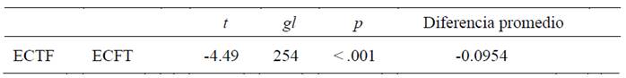 Respecto a la prueba t de student, en la Tabla 3 se encontró que existe una diferencia significativa (t= -4.49; p < .001) entre ambas direcciones del conflicto trabajo-familia y familia-trabajo, con una diferencia de -0.0954. Además, se observa que la dirección del conflicto es familia-trabajo, debido a que este tiene un mayor promedio (M= 2.48) que el conflicto trabajo-familia (M = 2.38).