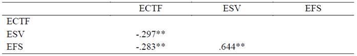 En la Tabla 4 se observa que existe una correlación significativa, negativa y baja entre la ECTF y ESV y entre ECTF y EFS. Además, se observa una correlación significativa, positiva y fuerte entre las variables ESV y EFS.
