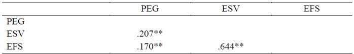 Por último, en la Tabla 5 se observa que existe una correlación significativa, positiva y débil entre las variables PEG y ESV y entre las variables PEG y EFS.