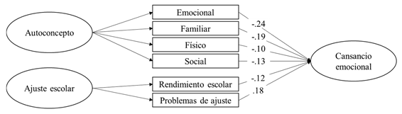 Al abordar la relación entre variables, se observó que la asociación entre el autoconcepto y el ajuste escolar fue de tipo positiva; mientras que la relación de ambas con el cansancio emocional fue de tipo negativa. Si bien algunos estudios previos habían confirmado relaciones significativas entre ellas (Dominguez-Lara, 2014; Fernández-Lasarte et al., 2018; Herrera et al., 2016; Lledó et al., 2014; Pérez et al., 2020; Portillo & Reynoso, 2021), al analizar la forma en que el autoconcepto y el ajuste escolar predicen el cansancio emocional, el modelo integró los factores emocional, familiar, social y físico del primer constructo y el rendimiento académico y los problemas de ajuste del segundo. La relación negativa del cansancio emocional con el autoconcepto y el ajuste escolar significa que a menor autoconcepto y ajuste es mayor el nivel de cansancio. En este sentido, cobra relevancia la competencia emocional en el contexto escolar, ya que representa un elemento de freno al estrés académico y a la actitud de estar quemado (burnout; Lledó et al., 2014). Lo anterior sugiere que un estudiante con un adecuado autoconcepto creerá en sí mismo y enfrentará de manera positiva los desafíos escolares, lo que aumenta sus posibilidades de éxito (Bernal & Gálvez, 2017).