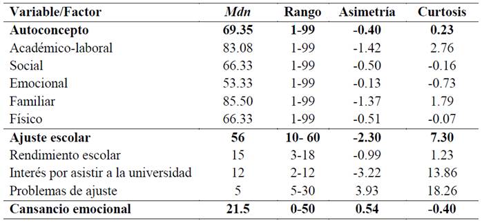 Comenzando por el autoconcepto, los resultados indican que, en general, los respondientes cuentan con niveles adecuados, tomando en cuenta que las medianas se encuentran por encima del valor medio del rango posible (Mdn > 50) y que existe una asimetría negativa. Es de subrayar que los factores familiares (Mdn = 85.50) y académico-laboral (Mdn = 83.08) obtuvieron las puntuaciones más altas, mientras que los factores emocional (Mdn = 53.33), físico (Mdn = 66.33) y social (Mdn = 66.33) las más bajas.