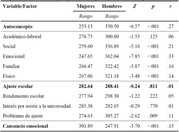 Se encontró una diferencia estadísticamente significativa en el total de autoconcepto (Z = -6.57; p< .001; r= .27) y en los factores social (Z = -5.16; p< .001; r= .21), emocional (Z = -7.85; p< .001; r= .33), familiar (Z = -3.87; p< .001; r= .16) y físico (Z = -3.48; p< .001; r= .16). En todos los casos, los hombres obtuvieron puntuaciones más elevadas que las mujeres con discrepancias entre pequeñas y medianas (Dominguez-Lara, 2018). Para el caso del ajuste escolar, solo la dimensión de problemas de ajuste mostró discrepancias (Z = -2.62; p= .009; r= .11), señalando que los hombres tienen mayor dificultad de adaptación (aunque tales diferencias fueron pequeñas). Por último, se encontraron diferencias en el cansancio emocional, en donde las mujeres manifestaron niveles ligeramente superiores que los hombres (Z = -3.70; p< .001; r= .15).