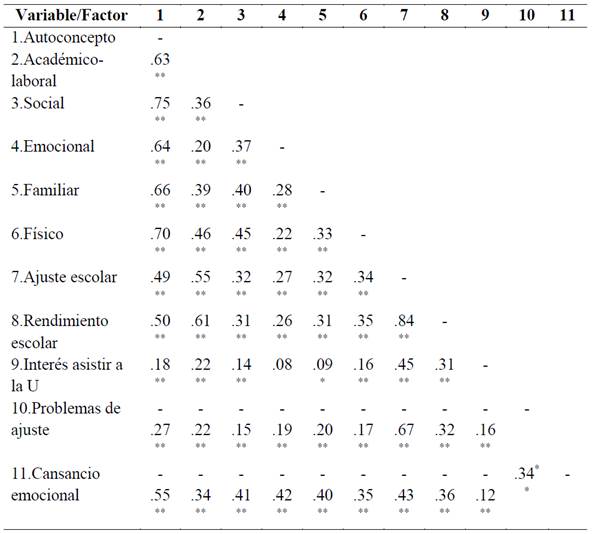 Dejando de lado las correlaciones entre las variables y sus propios factores, fue detectado una asociación de tipo positiva entre el autoconcepto y el ajuste escolar, con una fuerza de asociación que osciló entre muy baja y alta (rho> .08; < .61); solo el factor problemas de ajuste presentó su asociación de manera inversa. Por otro lado, el cansancio emocional mostró una correlación negativa con ambas variables (rho> .12; < .55), lo que indica que, al disminuir los niveles de autoconcepto y ajuste escolar, aumentan los valores de cansancio emocional.