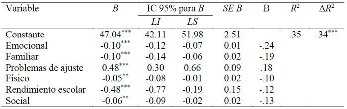 El modelo final quedó constituido por seis variables predictoras. En primer lugar, se integraron los factores emocionales (β = -.24) y familiar (β = -.19) del autoconcepto en sentido negativo y problemas de ajuste en sentido positivo. Todos ellos con una aportación moderada-baja a la varianza (Dominguez-Lara, 2018). Posteriormente se sumaron el factor físico (β = -.10) y social (β = -.13) del autoconcepto y el rendimiento escolar (β = -.12) de manera inversa con aportaciones débiles al porcentaje de varianza del modelo (Dominguez-Lara, 2018). En suma, los cuatro predictores explican el 35 % de la varianza (ΔR2 = .35). La Figura 1 muestra el modelo obtenido.