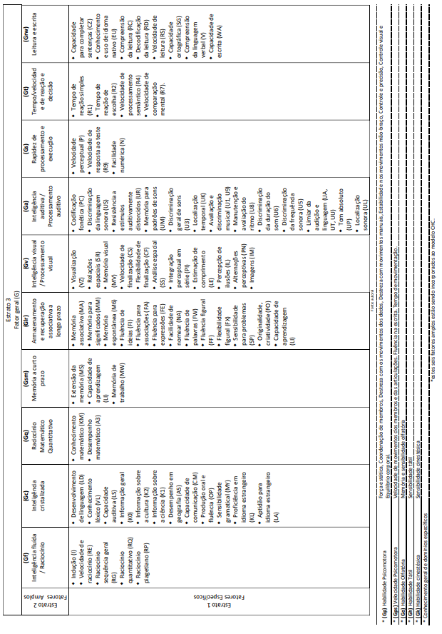 O CHC constitui-se em um modelo hierárquico de inteligência, composto por três estratos (Figura 1). No primeiro deles estaria localizado um fator geral de inteligência, seguido por 10 fatores mais amplos e cerca de 60 fatores específicos, ligados às capacidades específicas avaliadas em testes de inteligência (Bryan & Mayer, 2020).