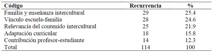 Esta subcategoría se relaciona con las características positivas que se desarrollan en el contexto educativo, que beneficia los procesos de enseñanza y aprendizaje en contexto de escuelas situadas en comunidades mapuche en La Araucanía. Dicha subcategoría obtiene una frecuencia de 57 % de un total de 200 recurrencias y se compone de cinco códigos (Tabla 2).