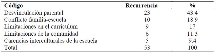 La subcategoría limitaciones de la escuela multinivel en contexto indígena refiere a los obstaculizadores que interfieren en el desarrollo de los procesos de enseñanza y aprendizaje. Esta subcategoría obtiene una frecuencia de 26.5 % de un total de 200 recurrencias y se compone de cinco códigos (Tabla 3).