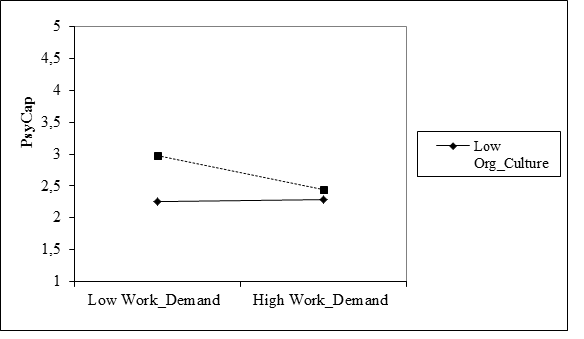 Hypothesis 4a: The organizational culture associated with values that prioritize employee satisfaction and well-being moderates the relationship of perceived work demand to positive psychological capital, which is weaker in organizations with this type of organizational culture.