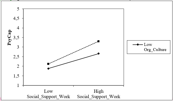 Hypothesis 4b: The organizational culture associated with values that prioritize employee satisfaction and well-being moderates the relationship of social support at work to positive psychological capital, which is stronger in organizations with this type of organizational culture.
