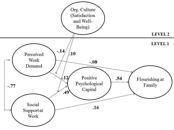 Abstract: Family-work conflict and enrichment are closely related processes. This study used the Work-Family Resources Model to investigate the direct effects of a demand (perceived work demands) and a contextual job resource (social support at work) on an outcome in the family (flourishing in the family), as well as the mediating role of a personal resource (positive psychological capital) and the moderating role of a macro resource (organizational culture associated with the employees’ values of satisfaction and wellbeing) in these relationships. The sample consisted of 1052 Brazilian workers of both sexes (72.5 % women) from 50 organizations. The results found in Multilevel Structural Equation Modeling provided empirical support for the model by confirming the relationships that were tested. These findings entail important theoretical and practical implications for the family-work relationship, in demonstrating how the different processes imbricated in the work-family interface can occur, and how they can contribute to the quality of life in the family context.