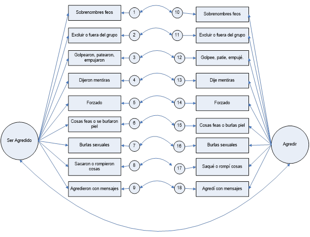 Las cargas factoriales del modelo de dos factores relacionados eran todas significativas y se hallaban entre .41 y .94. La correlación entre ambas dimensiones fue .43; p < .001. El alfa de Cronbach fue de .74 para la escala de ser victimizado y de .81 para la de bullying. El coeficiente de omega fue de .75 y .83, respectivamente.