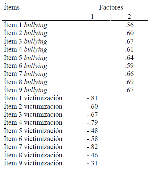 Con respecto al análisis factorial exploratorio, los resultados arrojaron un modelo de dos factores relacionados que podían ser denominado victimización y llevar a cabo el bullying, sin cargas cruzadas y cargando todas en su respectivo factor. Esto puede deberse a su infrecuencia en la presente muestra. Estas dos dimensiones son las postuladas por el autor del test (Olweus, 1996, 2013) y los dos factores medidos por el test. Estos resultados también coinciden con estudios en adolescentes de Argentina (Resett, 2011, 2018). Las dos dimensiones mencionadas demostraron su asociación con los problemas internalizantes y externalizantes en numerosos estudios (Olweus, 2013; Resett, 2018).