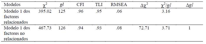 A continuación, se llevó a cabo el análisis factorial confirmatorio. También se puso a prueba un modelo de dos factores no asociados (Tabla 2). El modelo de dos factores asociados arrojó un ajuste más adecuado que el de dos factores no relacionados, como lo indican valores más elevados de CFI, TLI y RMSEA menores, respectivamente.