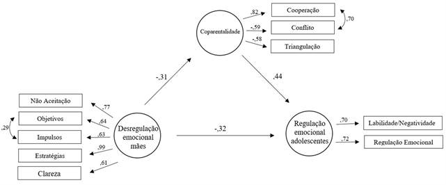 Quanto aos coeficientes padronizados de regressão do modelo, as direções já indicavam que as dimensões da desregulação emocional das mães interferem negativamente na regulação emocional percebida dos filhos adolescentes, bem como negativamente na variável mediadora coparentalidade (apresentou um caminho negativo para cooperação, enquanto para conflito e triangulação se relaciona positivamente). Identifica-se que a previsão das dimensões da desregulação emocional das mães para coparentalidade (β = -0,31) e para regulação emocional dos adolescentes (β = -0,32) apresentou índices moderados.