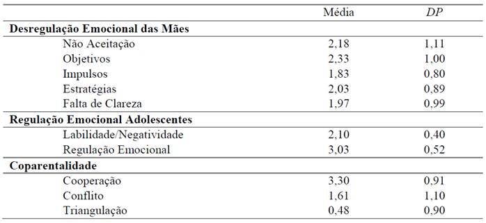 Foram realizadas estatísticas descritivas com as variáveis trabalhadas neste estudo, desregulação emocional das mães com as dimensões: não aceitação das emoções negativas (Não Aceitação), incapacidade de se envolver em comportamentos dirigidos por objetivos quando experiencia emoções negativas (Objetivos), problemas em controlar comportamento impulsivo quando experiencia emoções negativas (Impulsos), acesso limitado às estratégias de regulação emocional (Estratégias) e falta de clareza emocional (Clareza) (variável exógena), regulação emocional dos filhos adolescentes: dimensões labilidade/negatividade e regulação emocional (variável endógena) e coparentalidade: dimensões cooperação, conflito e triangulação (variável mediadora). A descrição das análises de média e desvio padrão se encontra na Tabela 1.