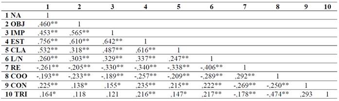As experiências de desregulação emocional das mães medidas pela DERS, apontaram que essas estão relacionadas com as variáveis de mediação e de desfecho. Depois de verificar que se tratava de uma amostra não-normal, foi realizada a análise de correlação de Spearman para avaliar as relações internas entre as dimensões. Muitas correlações moderadas e altas foram observadas, conforme apresentado na Tabela 2.