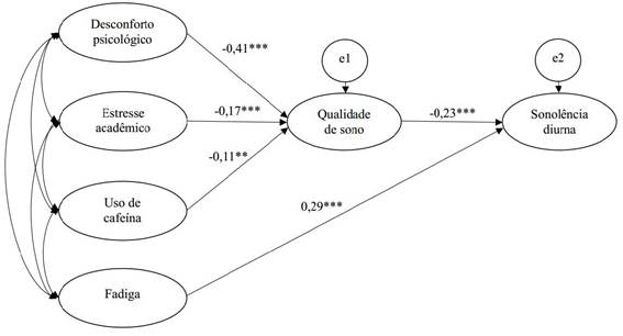 Resumo: O presente estudo teve como objetivo testar, através de equações estruturais, um modelo explicativo da qualidade do sono e da sonolência diurna entre estudantes universitários brasileiros (N = 407). Os participantes responderam ao Índice da Qualidade do Sono de Pittsburgh (PSQI), à Escala de Sonolência de Epworth (ESS-BR), ao Questionário de Saúde Geral (QSG-12), à Escala de Avaliação de Fadiga (EAF), à Escala de Estresse Acadêmico (EEA), ao Questionário sobre Tempo de Uso de Drogas (QTUDR) e às informações demográficas. As análises de correlações bivariadas e regressões múltiplas forneceram elementos para a elaboração de um modelo explicativo que incluíram como variáveis explicativas o desconforto psicológico, o estresse acadêmico e o uso de cafeína, como preditores da qualidade do sono e, esta última juntamente com a fadiga, explicando a sonolência diurna. Este modelo apresentou índices adequados de ajuste aos dados empíricos. É possível concluir que maiores níveis de estresse acadêmico, desconforto psicológico, fadiga e uso de cafeína estão associados a menores índices de qualidade do sono entre estudantes universitários. Os resultados demonstram a relevância de considerar variáveis individuais e contextuais para compreender o ciclo vigília-sono no âmbito acadêmico. Essas variáveis devem ser consideradas em futuros estudos que procurem aplicar e avaliar possíveis programas de intervenção.