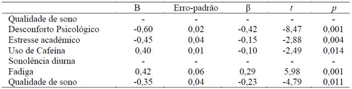 Para a QS (Tabela 2), as variáveis DP, EA e o uso de cafeína entraram como preditores significativos, todas apresentando coeficientes negativos. Especificamente, em conjunto, tais variáveis (R = 0,55, F(3, 404) = 56,94, p < 0,001) explicaram 31,2% da variância total (R2 ajustado). Para o segundo modelo de regressão, para explicar a SD, observou-se (Tabela 2) que a fadiga, positivamente, e a QS, negativamente, predisseram de forma significativa tal variável critério. Conjuntamente, tal modelo (R = 0,43, F(2, 406) = 47,25, p < 0,001) explicou 19,1% da variância total (R2 ajustado).