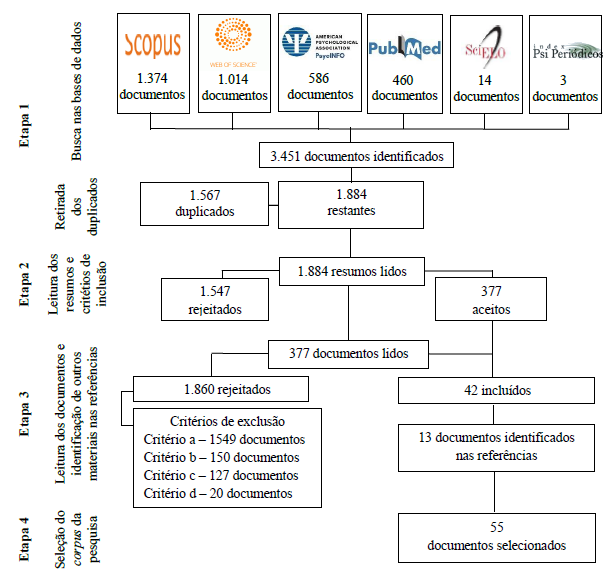 Por meio das referências desses documentos, identificaram-se outros 15 que tratavam do desenvolvimento de medidas psicométricas de agência. Desses, incluíram-se apenas 13 porque dois não foram encontrados disponíveis, totalizando 55 documentos selecionados. O fluxograma da coleta de dados e delimitação do corpus de pesquisa está ilustrado na Figura 1.