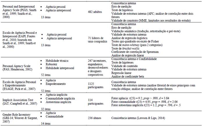 Há fragilidades no tocante à robustez das propriedades psicométricas dos instrumentos, já que a maior parte se limita a apresentação de evidências de validade de estrutura interna. As validades convergentes e divergentes são pouco exploradas, o que pode se dar em função da dificuldade em identificar instrumentos que possibilitem essa verificação ou pela falta de clareza conceitual sobre agency para que seja possível estabelecer esses critérios. Não foram identificados instrumentos que visem a mensuração da agência com validade estatística para o português, tampouco no contexto brasileiro. O único instrumento adaptado para esse idioma apresentou somente validação semântica o Agency Beliefs (Smith et al., 2000) adaptado por Fontes et al. (2010).