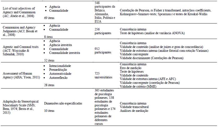 Diferentes perspectivas teóricas a respeito dos estudos sobre agência podem ser observadas por meio dos instrumentos de mensuração do construto a partir do referencial teórico que os embasa e se reflete na dimensionalidade das escalas. Os primeiros instrumentos identificados estão alinhados com a perspectiva teórica que relaciona sexo, gênero e a influência na agência e comunalidade, que tem como base a ideia de representação de papéis sociais de homens e mulheres e os estereótipos associados. A partir dessa compreensão, o senso de agência está associado ao masculino, com características de determinação, individualismo, ação, competência, ambição, dominância, objetividade, por exemplo. Já o senso de comunalidade direciona-se ao feminino, contemplando o cuidado, coletivismo, moralidade, interdependência e investimento parental, por exemplo (Abele et al., 2008). Nove instrumentos identificados estão alinhados a essa perspectiva: o PAQ, EPAQ, GEPAQ, IAT, GRI-14, AC, ACJ, AC e ASMS.