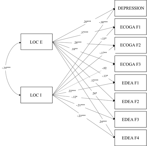 In this study, two models were proposed to measure the predictive and mediating capacity of the construct. The first model evaluated the direct predictive power of the locus of control with all variables (depression, anxiety factors and emotional dysregulation) and the second model, the locus of control acted as a mediator of the relationship between the factors of emotional dysregulation (seeking strategies and pessimism) and depression and anxiety. The choice to keep emotional dysregulation as a predictor was due to the fact that the measure used to assess this construct was developed considering emotional self-regulation in relation to sadness. In other words, starting from the difficulty of managing sadness, could the locus of control contribute in a protective or deleterious way to the levels of anxiety and depression? The hypotheses were that the external locus of control would be found to be a predictor of psychopathologies, as well as emotional dysregulation as it is commonly associated with negative emotions and the internal locus of control would be negatively associated with these, with internality expected to be a protective aspect.