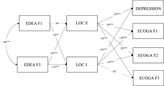 In model 1, the internal and external loci of control were predictors of all aspects of emotional dysregulation, of depression and of the anxiety factors, except for the internal locus of control which was not a predictor for intolerance of uncertainty. In the second model (Figure 2), the locus of control was placed as a mediator between the variables of emotional dysregulation (strategy and pessimism) and the anxiety factors and depression. The paths between the externalization of aggressiveness (F2) and paralysis (F4) variables did not present paths with statistical significance when mediated by the locus of control and, therefore, in a second stage of analysis, they were excluded.