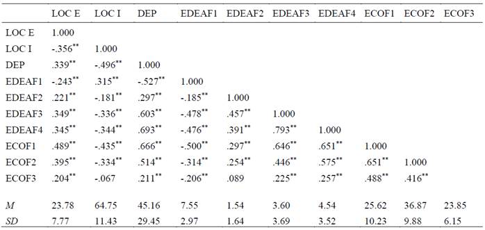According to Table 1, all variables showed correlations with statistical significance (p <.01), except for the intolerance of uncertainty variable with the internal locus of control and with externalization of aggressiveness. The external locus of control had a moderate negative correlation with the internal locus of control (rs = -.356).