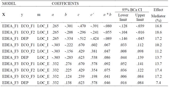 According to Table 2, the internal and external loci of control were mediators in all proposed models. The mediation effect (indirect effect) was significant in all cases and the mediator effect ranged from 7.4% (pessimism → depression) to 17.4% (pessimism → intolerance of vulnerability) for the external locus and from 10.2% (pessimism → negativity) to 18.6% (strategy → intolerance of vulnerability) for the internal locus of control.