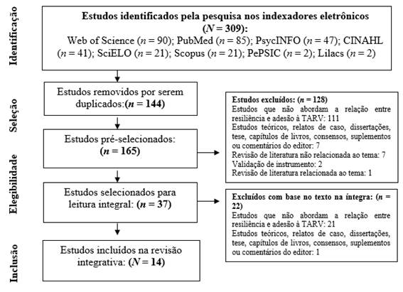 Os critérios de inclusão estabelecidos para a seleção dos artigos foram: a) artigos empíricos que identificassem a relação entre resiliência e adesão à TARV; b) artigos publicados nos idiomas inglês, espanhol ou português e c) artigos realizados com PVHIV. Foram excluídos artigos de revisão de literatura, estudos teóricos, relatos de caso, dissertações, teses, capítulos de livros, livros, consensos, suplementos ou comentários ao editor ou do editor, obituários, bem como trabalhos sobre elaboração e validação de instrumentos.