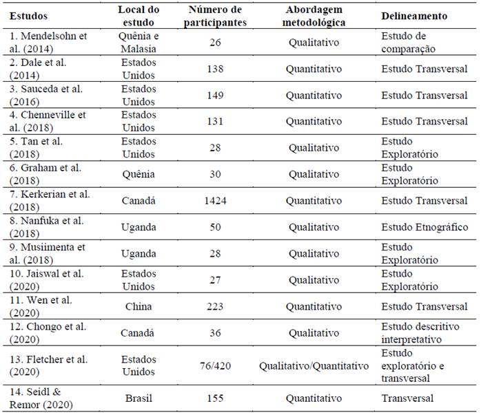 Com relação aos participantes, três trabalhos foram realizados com homens que fazem sexo com homens (HSH); desses, dois estudos realizaram-se com a população negra (Tan et al., 2018; Graham et al., 2018) e um estudo com HSH de um centro de saúde americano para latinos próximo à fronteira com o México (Sauceda et al., 2016). Três artigos foram realizados com mulheres (Dale et al., 2014; Fletcher et al., 2020; Kerkerian et al., 2018). Dois estudos investigaram usuários de centros de saúde públicos com recursos limitados no continente africano (Musiimenta et al., 2018; Nanfuka et al., 2018). Um trabalho se deu com a população negra e latina de baixa renda (Jaiswal et al., 2020). Um estudo foi realizado com refugiados (Mendelsohn et al., 2014). Uma pesquisa entrevistou adolescentes e jovens adultos com HIV (Chenneville et al., 2018), enquanto Chongo et al. (2020) investigaram homens nativos canadenses. Wen et al. (2020) entrevistaram usuários de serviços de saúde de uma cidade chinesa e Seidl e Remor (2020) abordaram pessoas em acompanhamento médico e psicossocial em um hospital brasileiro.