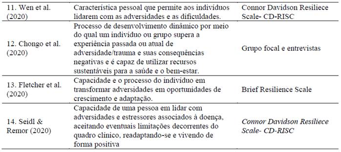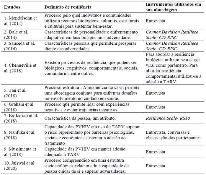 Mendelsohn et al. (2014), Chenneville et al. (2018), Tan et al. (2018), Graham et al. (2018), Jaiswal et al. (2020), Chongo et al. (2020) e Fletcher et al. (2020) abordaram resiliência como um processo. Destaca-se que Chenneville et al. (2018) trazem em seu trabalho processos de resiliência, em que essa pode ser abordada como biológica, comportamental, social e comunitária. Em cinco pesquisas a resiliência foi definida como uma característica da pessoa que lhe permite lidar com as adversidades (Dale et al., 2014; Kerkerian et al., 2018; Sauceda et al., 2016; Seidl & Remor, 2020; Wen et al., 2020). Já Nanfuka et al. (2018) e Musiimenta et al. (2018) abordaram a resiliência como a capacidade da PVHIV superar adversidades e sustentar a adesão ao tratamento, nesses dois estudos e no de Chenneville et al. (2018) a adesão aos antirretrovirais foi uma indicadora de resiliência.