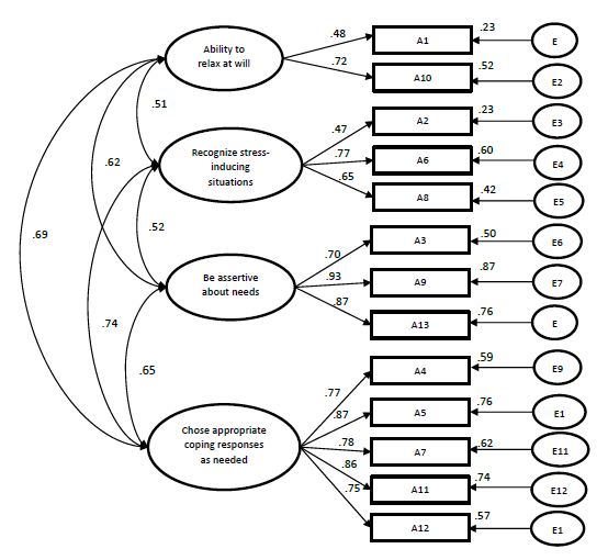For part A (current self-perceived status), an internal consistency of .90 (standardized Cronbach’s alpha), and an explained variance of 74.2 % was found with four factors: 1) Recognizing stress-inducing situations α = .73, 2) Being assertive about needs α = .86, 3) Choosing appropriate coping responses as needed α = .90 and 4) Ability to relax at will α = .51.