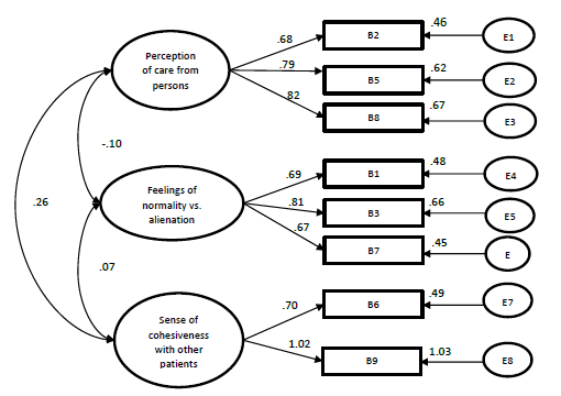 For part B (nonspecific effects) an internal consistency of .61 (standardized Cronbach’s alpha), and an explained variance of 74.3 % was found with three factors: 1) Feelings of normalcy vs. alienation α = .76, 2) Perception of care from persons around them α = .79 and 3) Sense of cohesiveness with other patients α = .83. One factor, Sense of being better off than other cancer patients α = .32 was removed because the alpha level was not satisfactory (Taber, 2018).