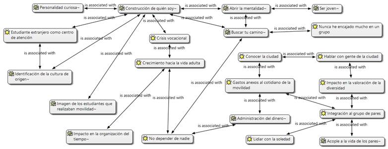 La red semántica 3 (Figura 3) se centra en los procesos de construcción del yo y cómo la movilidad estudiantil aporta dentro de períodos complejos de crisis vocacional, personal y a puertas de ingresar al mundo laboral.