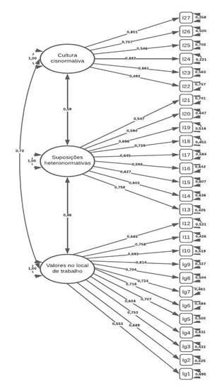 A segunda parte da pesquisa, referente à investigação de evidências de validade baseadas na estrutura interna, visou garantir a aplicabilidade do instrumento no contexto brasileiro. A partir da adoção da AFC foi possível investigar se a teoria subjacente (modelo investigado) se ajustava aos dados obtidos no contexto brasileiro. Considerando o modelo de primeira ordem com três dimensões (valores no local de trabalho, suposições heteronormativas e cultura cisnormativa), os resultados indicaram um excelente ajuste aos dados, mostrando-se superior aos resultados preliminares obtidos no estudo original. Isto porque, no caso da presente pesquisa, todos os indicadores investigados apresentaram resultados adequados considerando os valores de referência adotados. Por sua vez, o estudo original apresentou CFI abaixo do indicado, apesar do RMSEA e SRMR dentro do esperado, o que indicaria sua utilização (Resnick & Galupo, 2019).